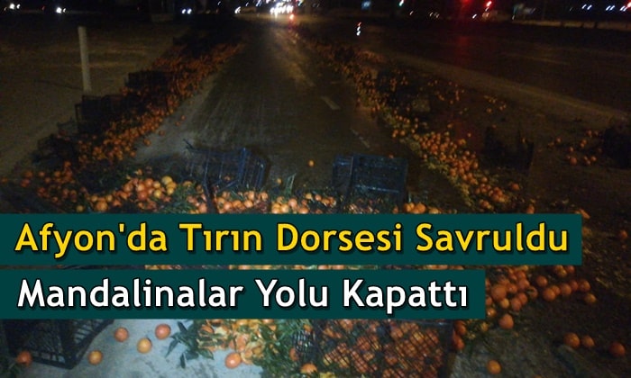 Olay, Afyonkarahisar OSB kavşağında yaşandı. Öğrenilen ve gelen bilgiler doğrultusunda, Mersin’den İzmir’e giden Aldülkadir B. hakimiyetinde bulunan 33 DCV 62 plakalı mandalina yüklü TIR, Afyonkarahisar’ın OSB kavşağına geldiği esnada direksiyon hakimiyetini kaybetmesi sonucu dorsesi savruldu. Dorsede bulunan tonlarca mandalina yola saçıldı. Olay yerinden geçen diğer sürücülerin ihbar etmesi ile birlikte kaza bölgesine polis ekipleri geldi. Polis ekipleri mandalina saçılan yolda başka kaza olmaması amacıyla bir takım önlemler aldı. Kazada ölen veya yaralanan olmazken polis konuyla ilgili olarak çalışma başlattı.