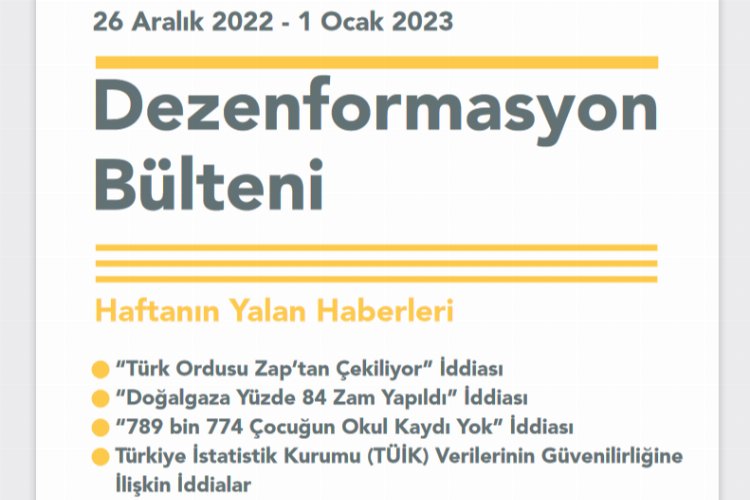 ANKARA (İGFA) – İletişim Başkanlığı’nca 26 Aralık 2022-1 Ocak 2023’ü kapsayacak şekilde hazırlanan Dezenformasyon Bülteni yayımlandı.