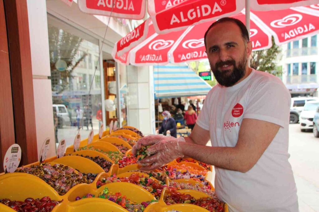 Bilecik’te Ramazan Bayramı öncesi bayram çikolataları ve şekerleri tezgahlarda yerinin alırken satıcılar işlerinin cumartesi ve arife günü artmasını bekliyor. Bayram şekeri ve çikolata satıcı İlhan Öztürk, fiyatların geçen yıla göre yüzde 40’a varan bir artış olduğunu anlatarak, “Şekerlerimizi ve çikolata çeşitlerimizi her sene olduğu gibi büyük bir umutla sergiledik. Bu sene daha çok umutluyuz. Sebebi ise pandemi sürecinin gerilemesi ve yasakların kalkması. Bu da insanların erken talep etmesiyle gözlemleyebiliyoruz. Yani şeker ve çikolatanın halk tarafından erken talep edilmesi bizi umutlandırdı açıkçası. En ucuz şekerin kilosu geçen sene 25’di, bu sene 30-35 arası değişiyor. Buna rağmen insanlarda bir talep var. Bunu görüyoruz. Çikolata fiyatları şekerlere göre daha yüksek. Çikolata üreticileri de yüzde 40 daha az üretim yapmaya başladı. Mesela biz 700-800 kilo talep ediyorsak, bunun 250,300 kilosunu gönderiyorlar. Yani siparişlerimizin yarısını gönderiyorlar. İnsanların yiyebileceği çikolatanın kilosu 80-100 lira arasında başlıyor. Tabi daha uygunları da var ama şeker oranı düşük, kokolin oranı yüksek” dedi.