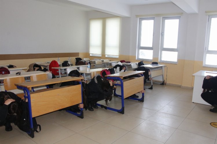 Sirenlerin çalması ile birlikte saniyelerle yarışan öğrenciler sınıflarda bulunan sıraların altına saklanıp kısa zamanda okulun bahçesindeki alanında toplandılar.