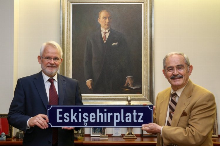 Ziyaret sonunda Başkan Büyükerşen ve Başkonsolos Regenbrecht, Frankfurt’ta Eskişehir ismi verilen meydanın, “Eskişehirplatz” yazılı tabelasıyla hatıra fotoğrafı çektirdi.