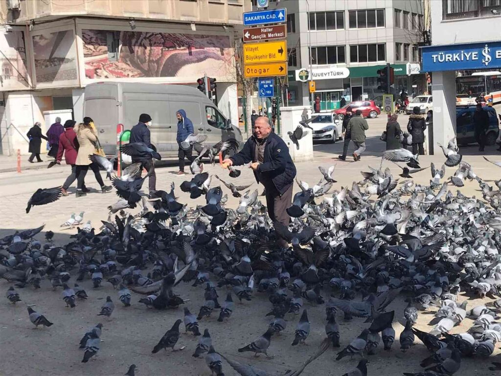 Güvercinlerin arasında yapılan besleme görenleri gülümsetti