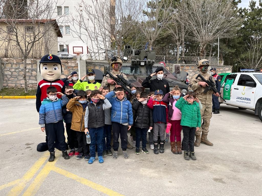 Ahmet Hamdi Bayraktar İlköğretim Okulu’nda eğitim gören 70 öğrenci, İl Jandarma Komutanlığı’nı ziyaret etti. Aile İçi Şiddetle Mücadele ve Çocuk Kısım Amirliği ekiplerinin gözetiminde çocuklar, Çevre, Doğa ve Hayvanları Koruma, Trafik ve Narkotik Köpek Timi birimlerinin çalışmalarını yakından tanıma fırsatı buldu. “Tim Jandarma” isimli animasyon çizgi filmi de izleyen çocuklar, trafik eğitim parkurunda akülü araçlarla sürüş deneyimi yaşadı. Ayrıca çocuklar, narkotik ve asayiş köpek timinin yaptığı gösteriyi izledi. Jandarma Komando Timleri’ni yakından görerek tanıyan çocuklar, zırhlı aracı inceleme fırsatı buldu.