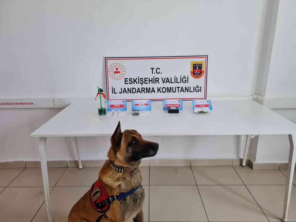Edinilen bilgilere göre, İl Jandarma Komutanlığınca uyuşturucu ile mücadele çerçevesinde yürütülen çalışmalar neticesinde; Kaçakçılık ve Organize Suçlarla Mücadele Şube Müdürlüğü (KOM) ekipleri uyuşturucu ve uyarıcı madde kullanan iki şüpheli şahsın kimliği tespit etti. KOM Şube ve Tepebaşı İlçe Jandarma Komutanlığı Asayiş ekiplerince Eskişehir-Bursa karayolu üzerinde yapılan uygulamada içerisinde şüphelilerin bulunduğu araç durduruldu. Narkotik köpeği Alfa’nın desteğiyle durdurulan araçta ve şüpheliler üzerlerinde yapılan arama neticesinde 5 gram metamfetamin, 8 gram esrar, 4 adet sentetik ecza olduğu değerlendirilen madde ve 3 adet ‘Bong’ olarak tabir edilen uyuşturucu madde kullanma aparatı ele geçirildi.