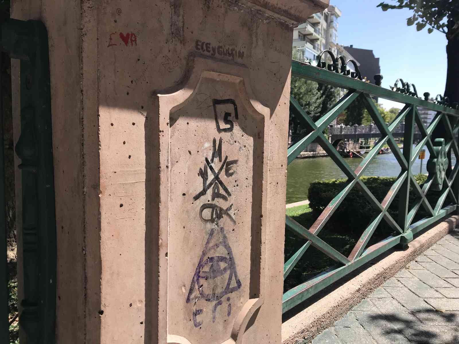 Eskişehir’in en önemli turizm simgelerinden olan Porsuk Çayı üzerinde yer alan saksılar, vandalların üzerine yazdığı yazılar sonucunda kirli görüntüsüyle dikkat çekiyor.