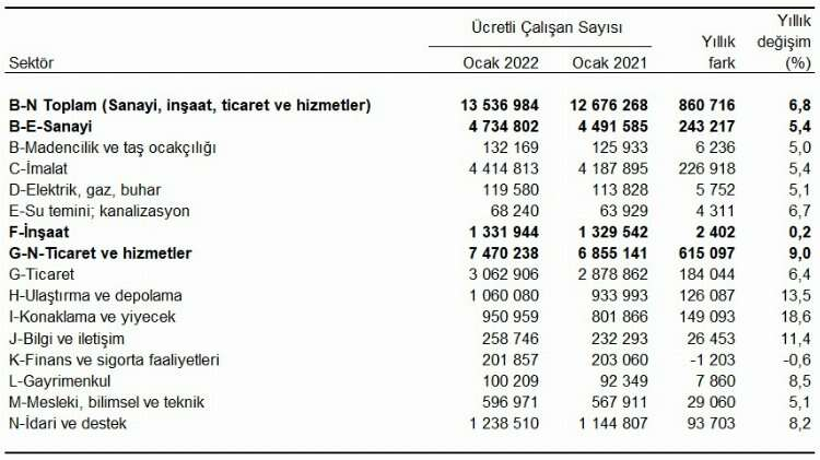 Sanayi, inşaat ve ticaret-hizmet sektörleri toplamında ücretli çalışan sayısı 2022 Ocak ayında bir önceki yılın aynı ayına göre yüzde 6,8 arttı. Ücretli çalışan sayısı bir önceki yılın aynı ayında 12 milyon 676 bin 268 kişi iken, 2022 yılı Ocak ayında 13 milyon 536 bin 984 kişi oldu.