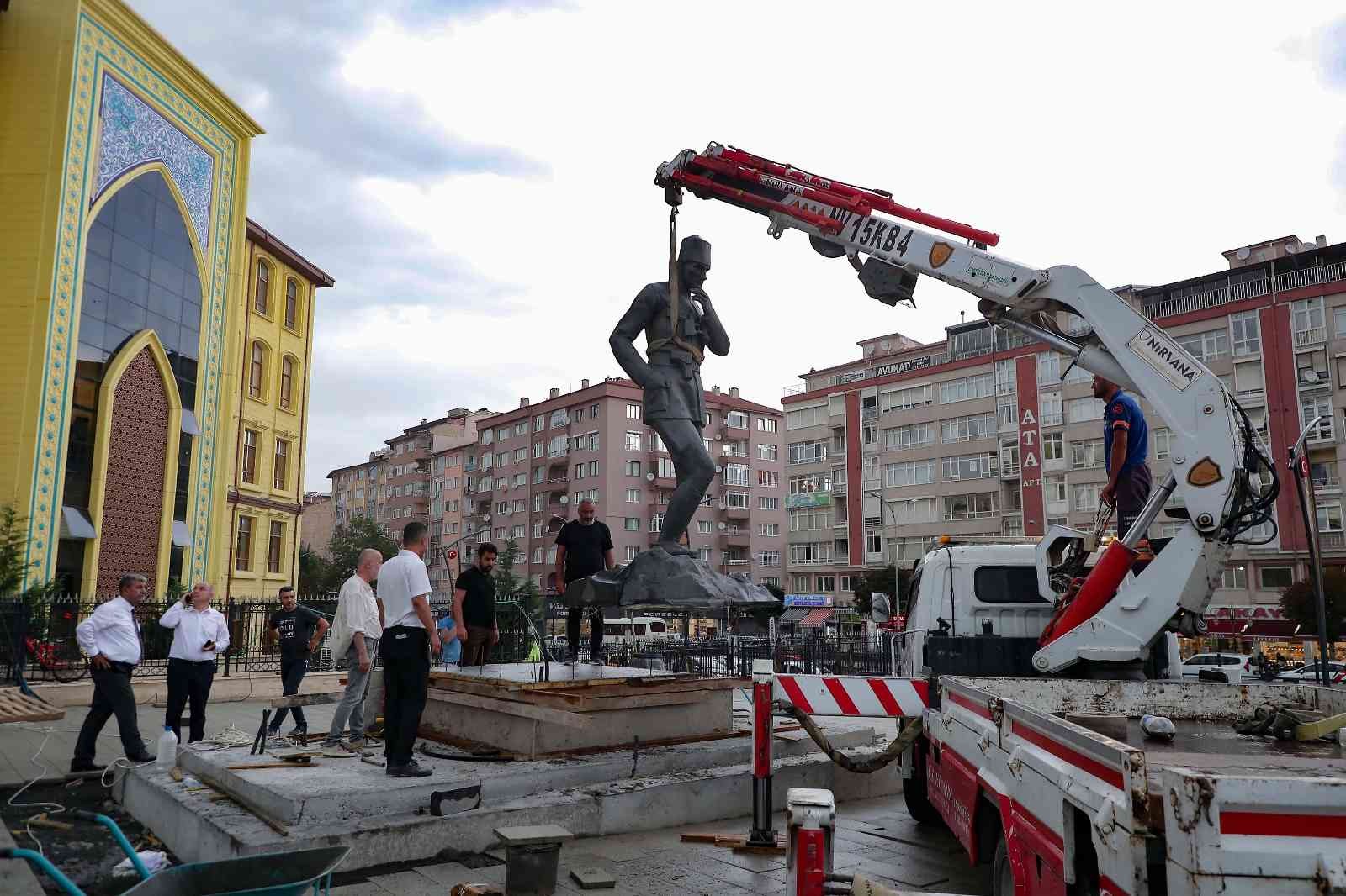 Zafer Meydanı imalatı esnasında geçici süre ile yerinden kaldırılan Atatürk heykeli bugün yeniden yeni yerine konuşlandırılarak, meydandaki yerini aldı.