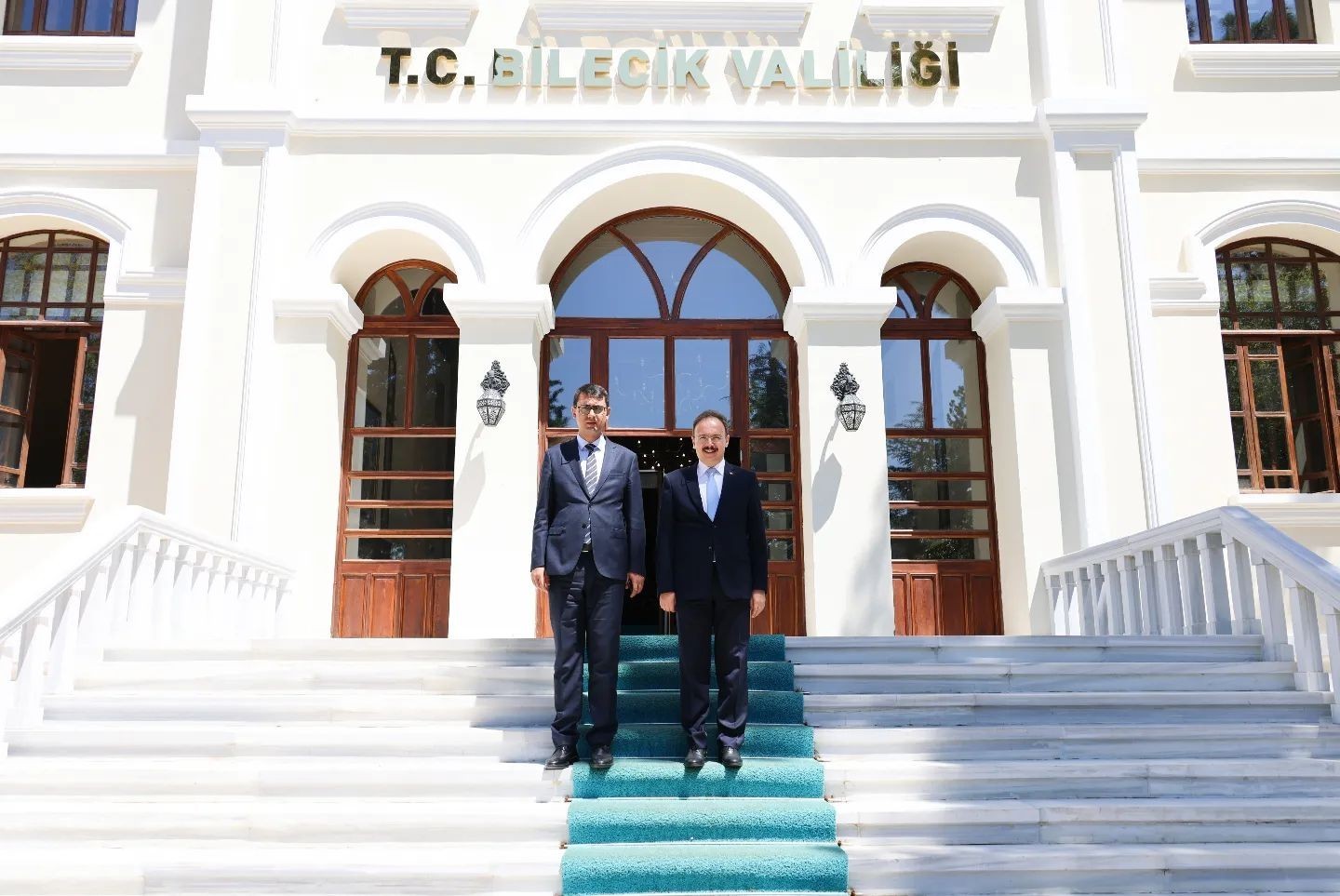 İçişleri Bakanlığı Destek Hizmetleri Dairesi Başkanı Serdar Kartal, Bilecik Valisi Dr. Kemal Kızılkaya’yı makamında ziyaret etti. Başkan Kartal’a Bilecik Valiliği Binasını gezdiren Vali Kızılkaya, binanın tarihi hakkında bilgi verdi. Ardından Vali Kızılkaya ve Bilecik İl Özel İdaresi Genel Sekreteri Seda Bayrakçı ile Bilecik Kamu Yerleşkesi Projesi’nin uygulanacağı alanda incelemelerde bulunan Kartal, projenin detaylarını inceledi.