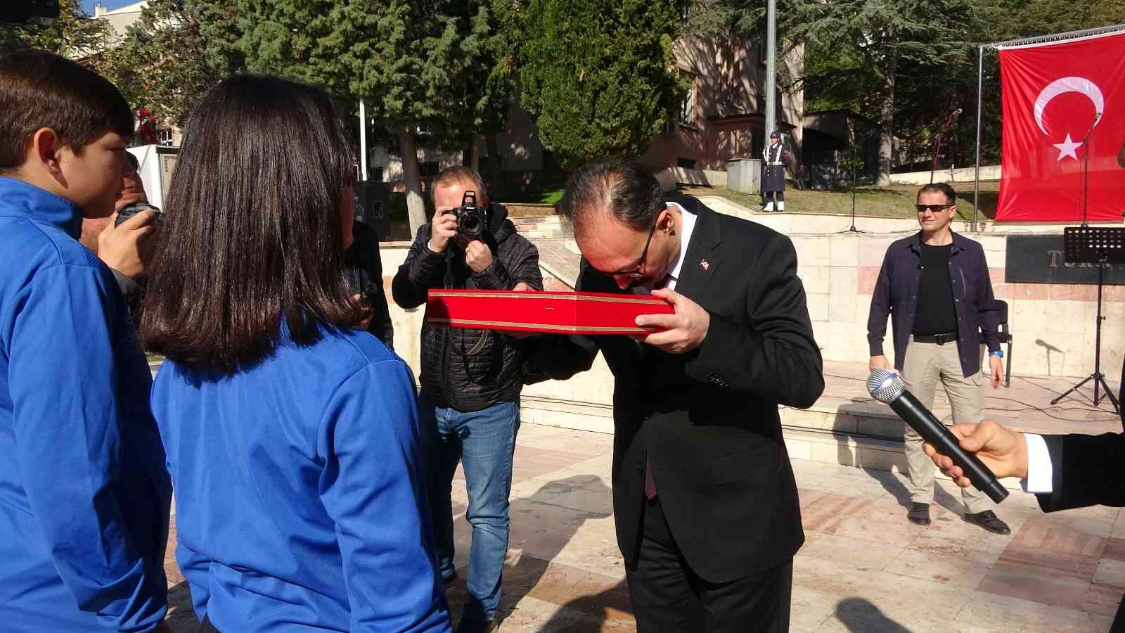 Konuşmanın ardından Cumhuriyet Koşusunu tamamlayan öğrenciler Vali Kızılkaya’ya, Türk bayrağını teslim etti. Vali Kızılkaya’da Türk bayrağını öperek teslim aldı.