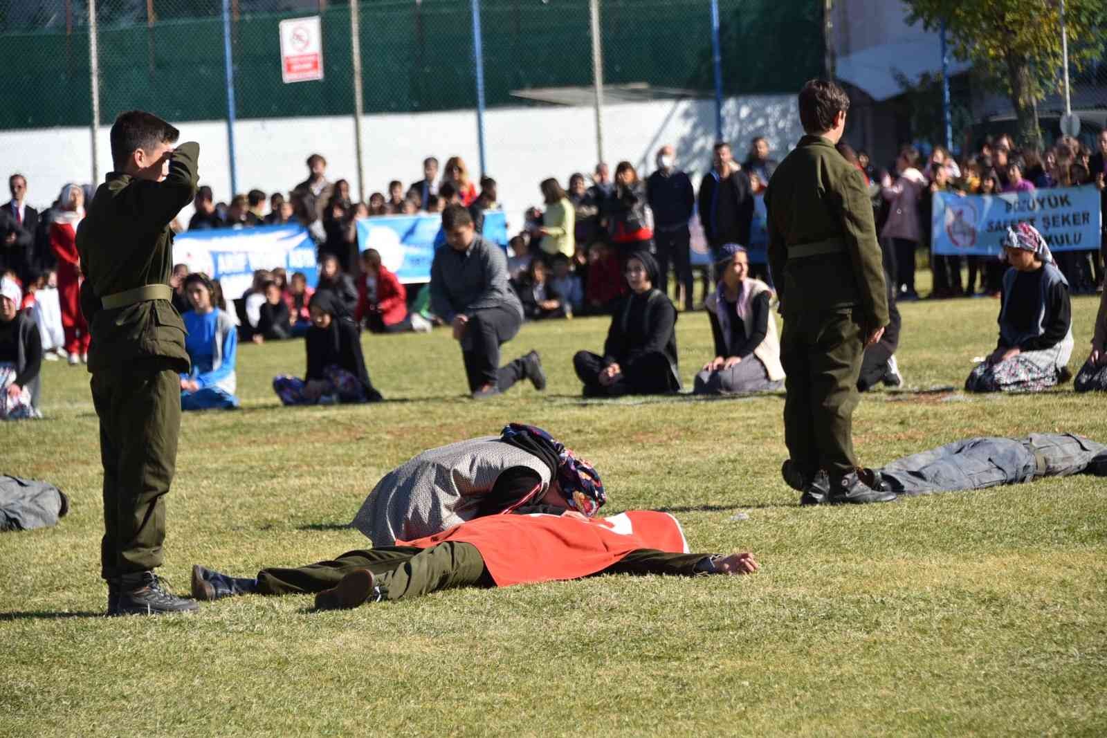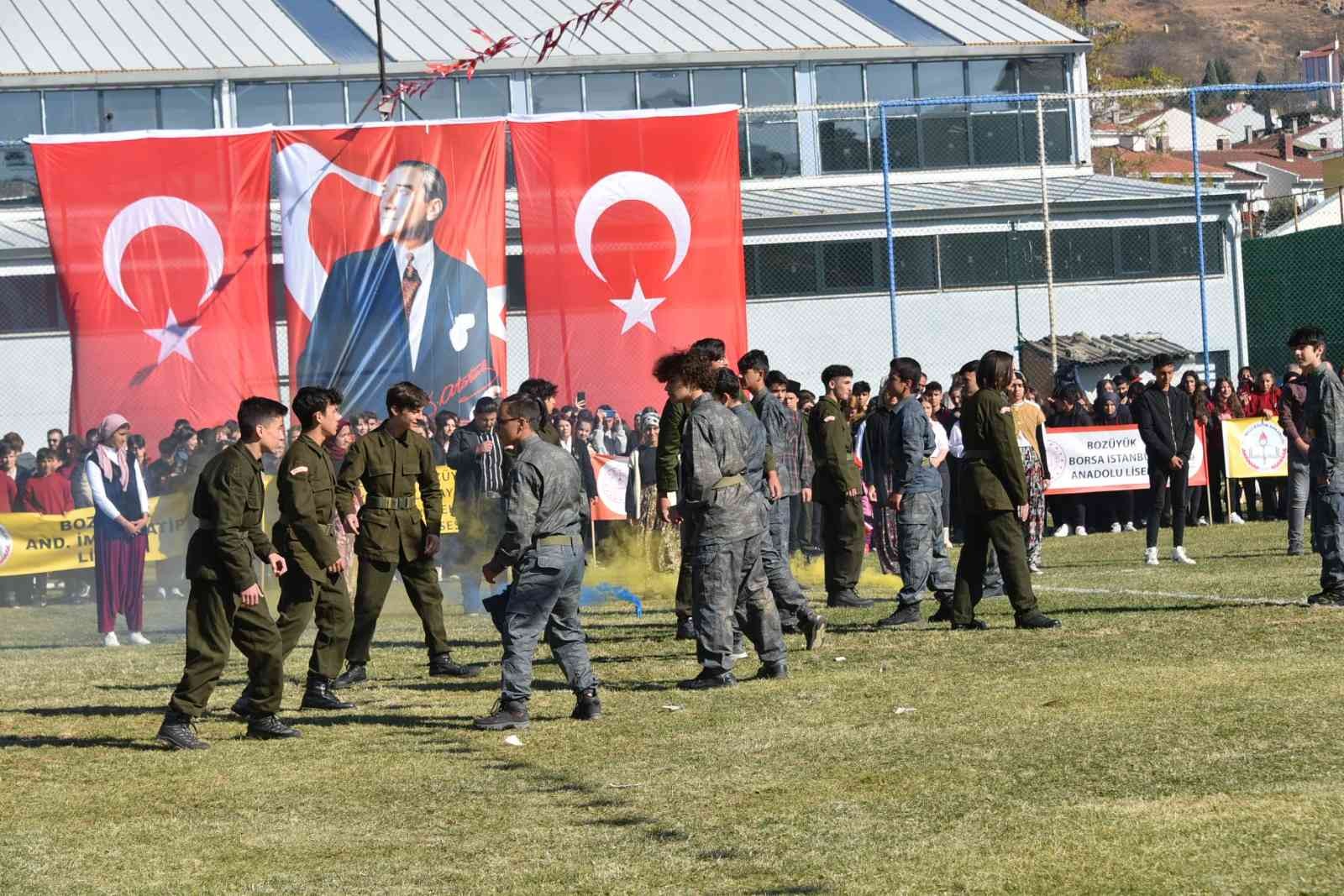 Ardından protokol üyeleri ve katılımcılar etkinliklerin yapılacağı Bozüyük Spor Salonu yanındaki çim sahaya geçti. Çim sahada düzenlenen törene protokol üyeleri ve öğrencilerin yanı sıra vatandaşlar da yoğun ilgi gösterdi. Tören ilk olarak Kaymakam Adem Öztürk, Garnizon Komutanı Vekili Mühimmat Üsteğmen Buğrahan Köse ve Belediye Başkanı Mehmet Talat Bakkalcıoğlu’nun halkın ve öğrencilerin bayramını kutlamaları ile başladı. Saygı duruşunda bulunulması ve İstiklal Marşı’nın okunmasının ardından devam eden programda Atatürk’ün sesinden 10. Yıl Nutku dinlendi. Günün anlam ve önemini belirten konuşma İlçe Kaymakamı Adem Öztürk tarafından yapıldı. Kaymakam Öztürk konuşmasında Cumhuriyet Bayramı’nı kutlayarak “29 Ekim 1923’ten bu güne “Cumhuriyetimiz” aziz milletimizin tabiatına ve geleneklerine en uygun, yüksek ahlaki değer ve niteliklere dayanan, erdemli, faziletli insanlar yetiştiren, yeni ve sağlam esaslarıyla Türk milletini istikbal yolunda hızla ilerleten, halkın gelişimini ve yükselişini sağlayan, birlik ve beraberlikten, bağımsızlık ve hürriyetten asla taviz vermeyen, çağdaş dünyada hak ettiği onurlu yeri alma kararlılığını tüm dünyaya gösteren bir yönetim şekli olmuştur. İnanıyorum ki aziz milletimizin her bir ferdi, milletimizin küllerinden yeniden doğduğu bu özel günü büyük bir coşku ile idrak etmekte, samimi duygularla kutlamaktadır.” dedi.