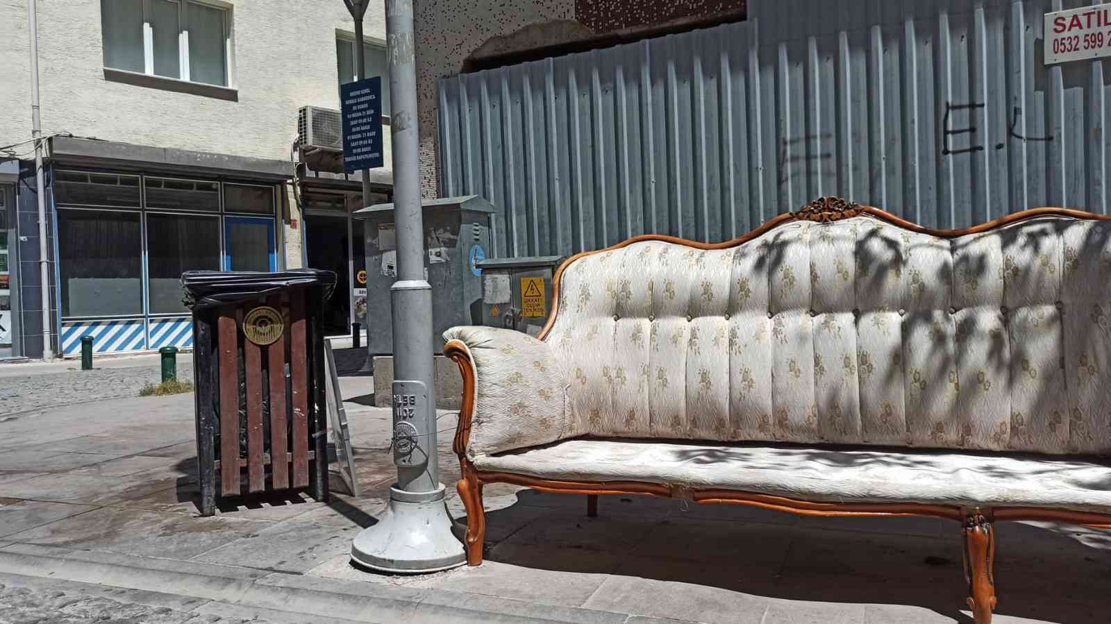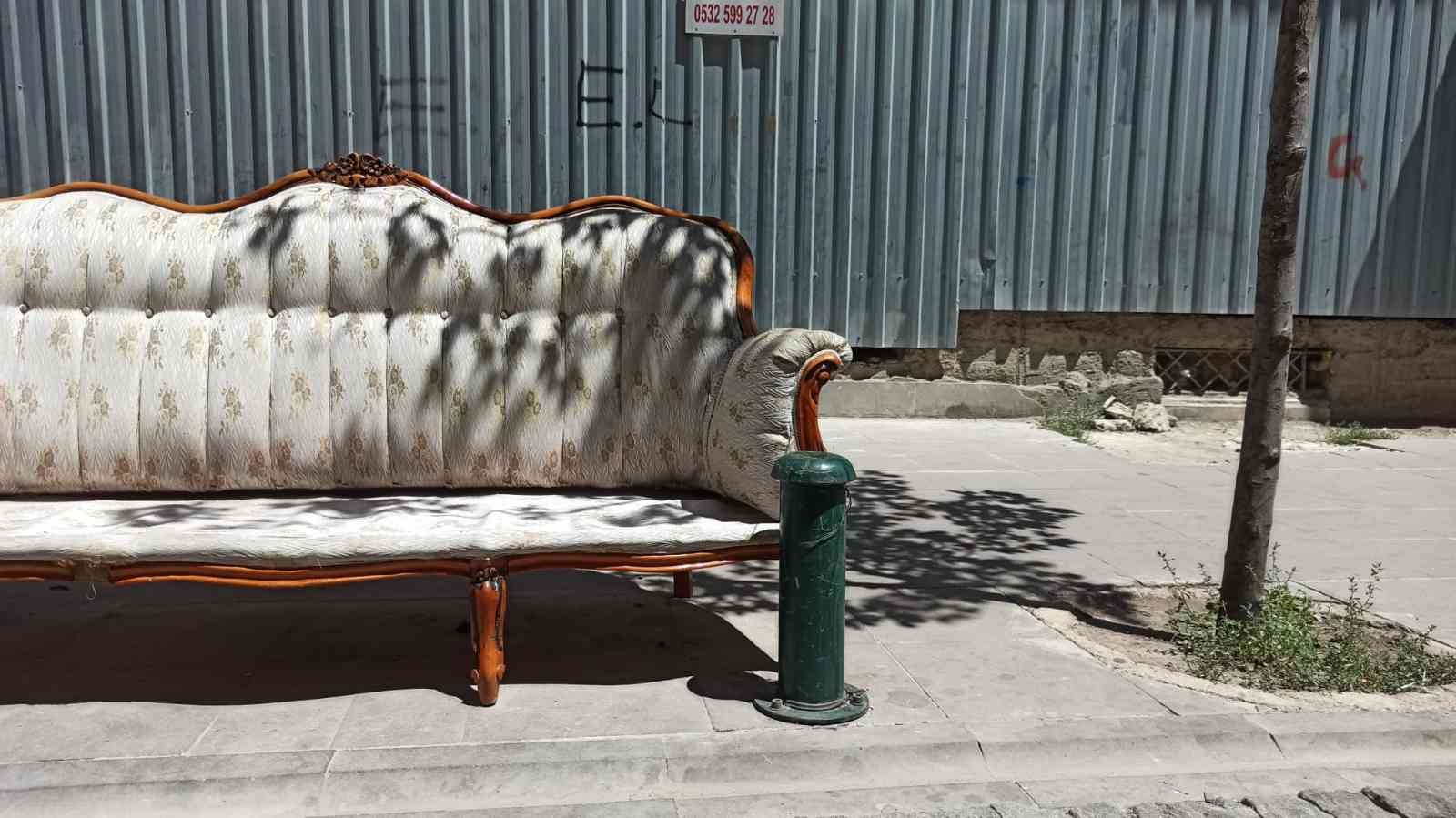 Eskişehir’de bir ara sokakta Karadenizli fırın işletmecileri tarafından, çalınmaması için tellerle elektrik direğine bağlanan koltuk dikkat çekiyor.