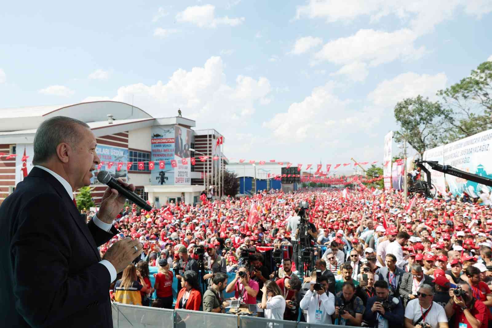 Erdoğan, “Sultan Alparslan Bizans’ın gururlu hükümdarı Diyojen’in sayıca üstün ordusunu yenerek Anadolu’nun kapılarını milletimize Malazgirt’te açmıştır. Milli Mücadele ile asırlardır tükenmeyen bir kin ve hırsla bizi bu topraklardan atmak isteyenlere Anadolu’nun ebedi vatanımız olduğunu bir kez daha ilan ettik. Selçuklu ve Osmanlı’nın mirasını devralan Cumhuriyetimizin kuruluşuna giden yolda ter ve kanla döşenmiştir. Birinci Dünya Savaşı’nda dört bir yanda yedi düvele karşı savaşan, pek çok yerde zaferler kazanan Osmanlı, İstanbul’un işgali ve Sevr dayatmasıyla adeta dermansız bırakılmıştı. Vatan topraklarını dört bir yandan işgale başlayan düşman, Adana, Antep, Maraş direnişleriyle pabucun pahalı olduğunu görünce, sinsi amaçlarının taşeronluğunu Yunan’a bırakmıştır. İstiklal mücadelesini Gazi Mustafa Kemal’in önderliğinde Anadolu’ya taşıyan milletimiz varını yoğunu ortaya koyarak hazırladığı ordusuyla, Kocatepe ve Dumlupınar’da yeni bir destanın girizgahını yapmıştır. Samsun ile başlayıp Ankara’da TBMM’nin açılışıyla dünyaya resmen ilan edilen bu sürecin her aşaması küllerinden yeniden doğan bir milletin uyanışının sembolüdür. Oldukça zor ve zahmetli bir sürecin ardından ordumuz yine bir Cuma günü 25 Ağustos’ta nihai zafer için son hazırlıklarını tamamlamıştır. O gece ezanlar okundu, namazlar kılındı, dualar edildi, son sıcak yemekler yendi ve ertesi sabah gün ağrırken hücum emri verildi. Kocatepe’den başlayıp Dumlupınar’a oradan İzmir’e kadar süren Büyük Taarruz, epeydir savunmada olan Türk ordusunun uzunca bir aradan sonra yaptığı ilk saldırı harekatıydı. Düşmanın belki makinelisi, topu, kamyonu, arabası, uçağı bizden çoktu ama bizim askerimizin iman dolu yüreği bu eksiklerin hepsini fazlasıyla telafi ediyordu. Nitekim Yunan ordusu çekilirken 200 bin kişilik kuvvetinin yüzde 65’ini Afyon-Kütahya hattında zayiat olarak bırakmıştır. Bu millet o imanlı yürekleriyle, imansızları İzmir’den denize döktü. Aşağı yukarı aynı sayıya sahip Türk ordusunun bu savaştaki kaybı ise sadece yüzde 6,5 civarındadır. Büyük Tarruz ve akabindeki çatışmalar dünya askeri tarihine en başarılı topyekûn savaş olarak geçmiştir. Türk’ün ölüm fermanı olarak tedavüle sokulan Sevr’i milletimiz işte bu topraklarda kanıyla canıyla yırtarak müstevilerin suratına çarpmıştır. Türk’ün esir edilemeyeceğini, Türk’e kefen biçilemeyeceğini 26 Ağustos’ta Afyon’da başlayıp, 9 Eylül’de İzmir’de sona eren bu kıyamla tüm dünyaya ilan ettik. Kocatepe’den başlayıp Dumlupınar’a uzayan büyük taarruz sonrası bu millet, o imanlı yürekleriyle imansızları İzmir’den denize döktü. Mücadelenin sadece silahla, parayla değil, imanla, kararlıkla azimle kazanıldığını herkes gördü” şeklinde konuştu.