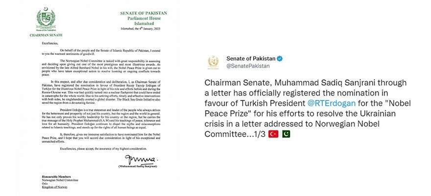 Cumhurbaşkanı Erdoğan’ın Nobel adaylığına ilk destek, Pakistan Senato Başkanı Muhammed Sadık Sanjrani’den geldi. Sanjrani, Norveç Nobel Komitesi’ne hitaben yazdığı bir mektupla, Ukrayna krizinin çözümüne yönelik çabalarından dolayı Cumhurbaşkanı Recep Tayyip Erdoğan’ı “Nobel Barış Ödülü” için aday gösterdi.