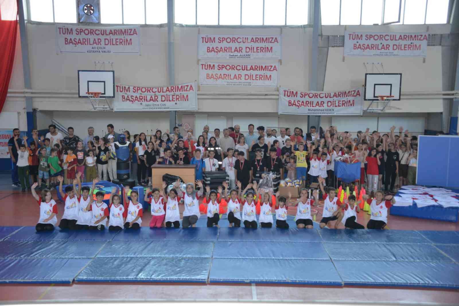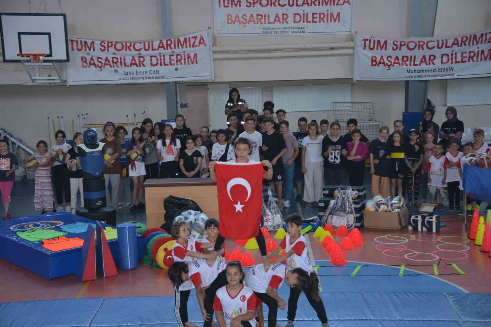 Gediz’de çocukları spora yönlendirmek amacıyla ücretsiz olarak açılan Yaz Spor Okulları’nda Gediz Belediye Başkanlığı tarafından futbol, basketbol, voleybol topları, kort tenisi raketleri, antrenman malzemeleri, jimnastik minderi, tramplen, trombolin ve file spor malzemeleri desteği verilerek, tişört dağıtımı yapıldı.