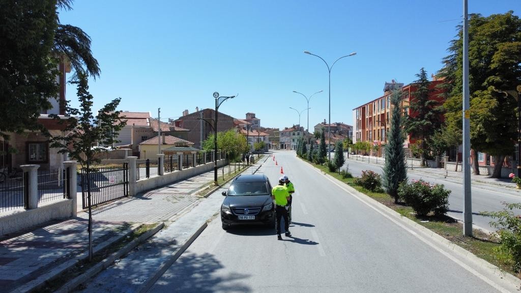 Bolvadin İlçe Emniyet Müdürlüğüne bağlı trafik polisleri tarafından ilçede sürücülere yönelik kırmızı ışık, emniyet kemeri ve cep telefonu denetimi yapıldı. Ekipler dron destekli denetimde durdurdukları sürücülerin ayrıca belge kontrollerini de yaptı. Denetimde kırmızı ışıkta geçen yabacı ülke plakalı bir otomobil ise polisin dronuna yakalandı. Işık ihlali yapan sürücü yol kenarındaki dubaları ve ilerisindeki uygulama noktasını fark edip kaçmak için ara sokağa girse de bunda başarılı olamadı. Dron ile sürücünün takibine devam eden polis ekipleri birkaç dakika sonra sürücüyü ara sokakta durdurup ışık ihlali yaptığı için 427 TL cezası kesti.