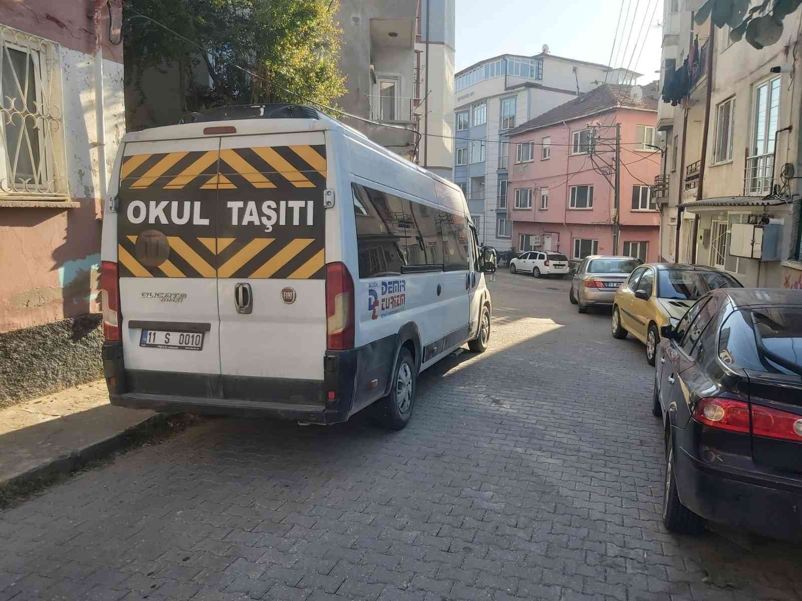 Bilecik’te bir sokağı kapatacak şekilde aracı park ederek başka bir yere giden öğrenci servisi sürücüsü cezadan kaçamadı.