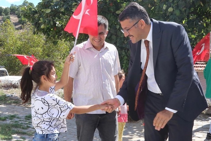 Simav ilçesinin bazı köylerinde ziyaretlerde bulunan Kütahya Valisi Ali Çelik’i Sudöşeği köyünün gençleri ve çocukları ellerinde Türk bayraklarıyla karşıladı.