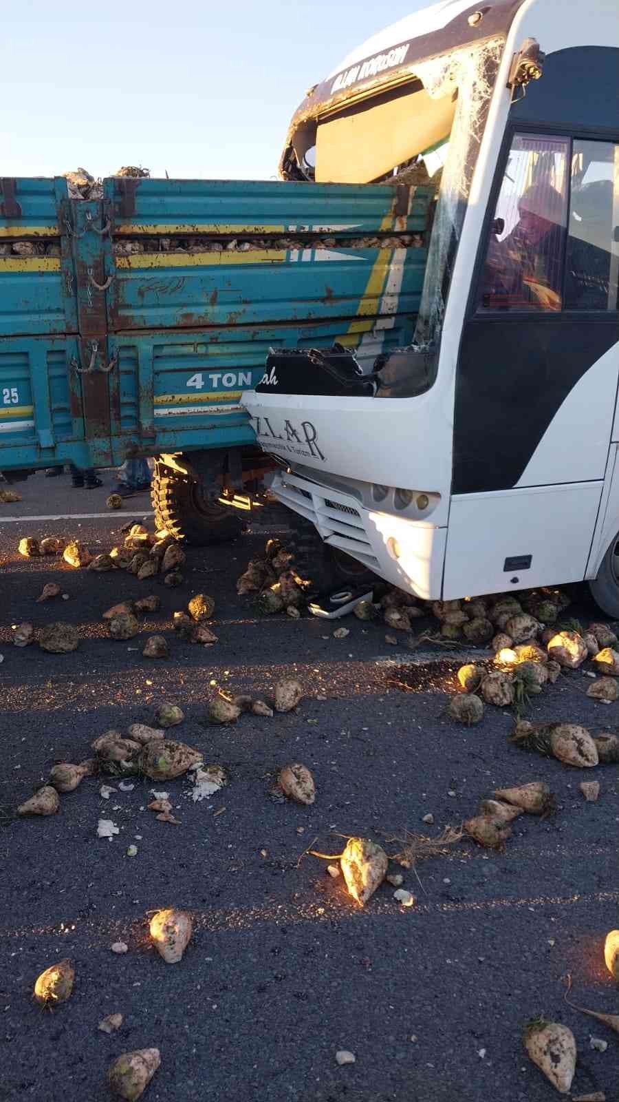 Kütahya’da işçi servisi ile traktörün çarpması sonucu meydana gelen trafik kazasında 13 kişi yaralandı.