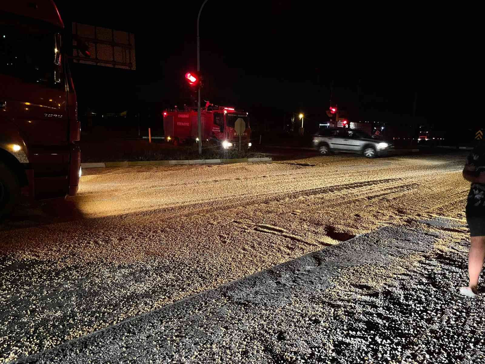 Afyonkarahisar’da kontrolden çıkarak makaslayan tırın dorsesindeki yaklaşık 2 ton mısır yola saçıldı. Ölen ya da yaralanan olmadığı olayda tonlarca mısır ziyan oldu.