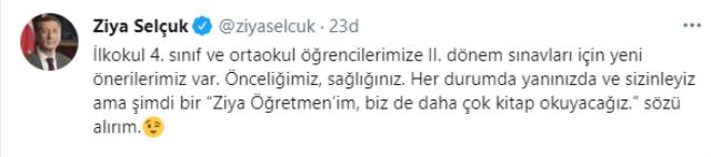 Bakan Selçuk, Twitter hesabından, “İlkokul 4. sınıf ve ortaokul öğrencilerimize II. dönem sınavları için yeni önerilerimiz var. Önceliğimiz, sağlığınız. Her durumda yanınızda ve sizinleyiz ama şimdi bir “Ziya Öğretmen’im, biz de daha çok kitap okuyacağız.” sözü alırım” dedi.
