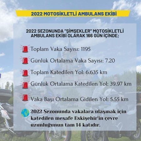 Eskişehir İl Ambulans Servisi bünyesinde hizmet veren Motosikletli Ambulans Ekibi, 2022 yılı sezonunda toplam bin 195 vakaya bakarken, olaylara ulaşım süresi ise ortalama 3 dakika oldu.