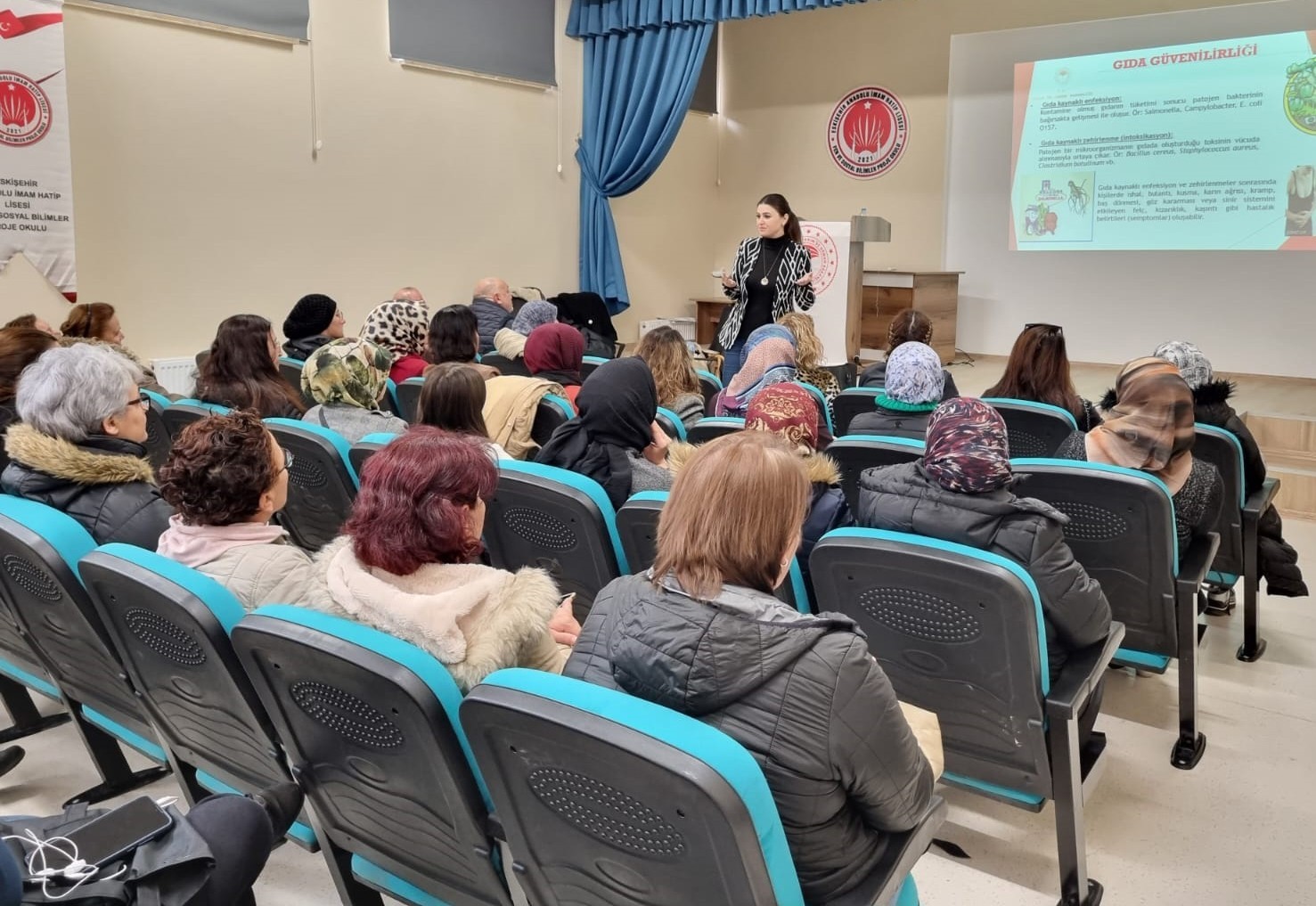Eskişehir Anadolu İmam Hatip Lisesi Konferans Salonu’nda eğitim; Eskişehir İl Tarım ve Orman Müdürlüğü, İl Milli Eğitim Müdürlüğü ve İl Sağlık Müdürlüğü’nün ortak çalışması ile gerçekleştirildi. İl Tarım ve Orman Müdürlüğü’nde görevli Gıda Mühendisi Zuhal Ünal Canbaz, Gıda Mühendisi Ece Dergi, Gıda Mühendisi Ayşe Özden, İl Sağlık Müdürlüğü’nde görevli Hemşire Yıldız Şeker, Ebe Elvan Erer, İl Milli Eğitim Müdürlüğü’nde görevli Sağlık Hizmetleri Sorumlusu Gülnur Barut, konuyla ilgili sunumlar yaptı. Düzenlenen programda; gıda işletmelerine ait özel hijyen gereklilikleri, personel hijyeni, işletme hijyeni, gıda maddelerinin depolama ve muhafazası, gıdaların hazırlanması ve işlenmesi, kantin çalışanlarının uyması gereken hijyen kuralları, gıdalarda bulunması muhtemel tehlikeler, gıdanın bozulması ve bozulma sebepleri, gıda kaynaklı enfeksiyon ve zehirlenmeler ile ilk yardım eğitimi konularında sunum yapıldı.