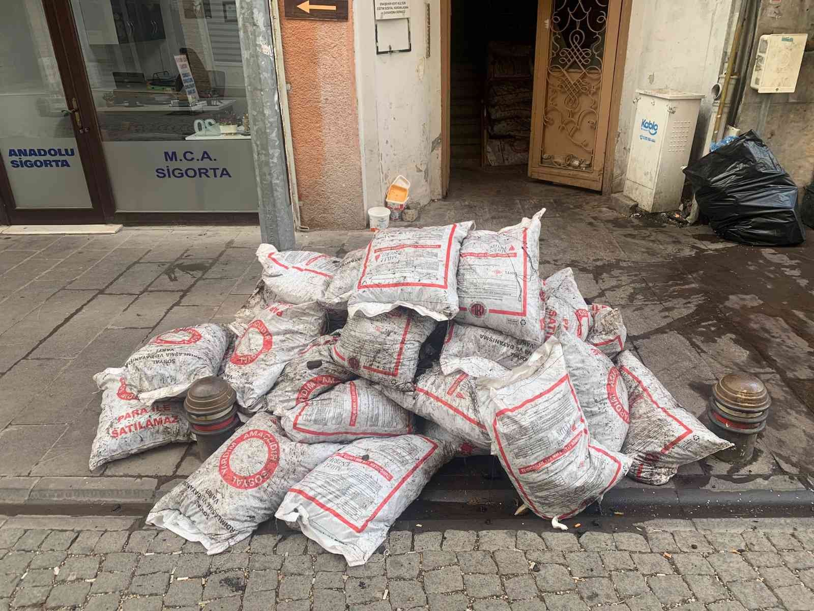 Eskişehir’in ara sokaklarında gelişigüzel yığılan kömür torbaları yayaların kaldırımı kullanmasını engelliyor.