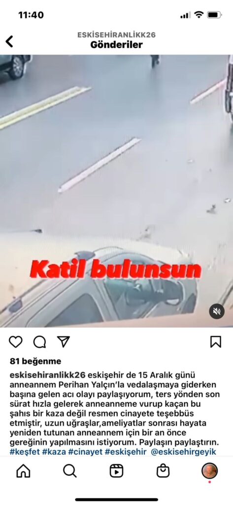 “15 Aralık günü anneannem Perihan Yalçın ile vedalaşmaya giderken, başına gelen acı olayı paylaşıyorum. Ters yönden son sürat hızlı gelerek anneanneme vurup kaçan bu şahıs kazaya değil, resmen bir cinayete teşebbüs etmiştir. Uzun uğraşlar, ameliyatlar sonrası hayata yeniden tutunan anneannem için biran önce gereğinin yapılmasını istiyorum.”