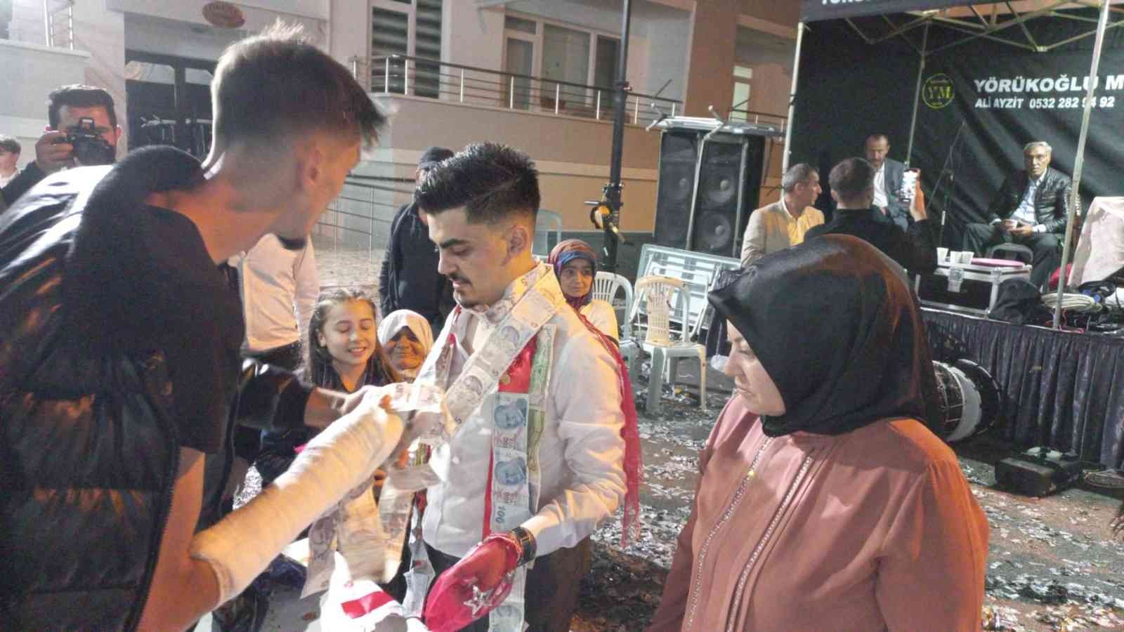 Düğünde daha sonra takı merasimine geçilerek kimisi hediyelik altın kimisi de döviz takarken, asker adayı Serhat Acar’ın arkadaşları tarafından da metrelerce uzunluğunda Türk parası takıldı.