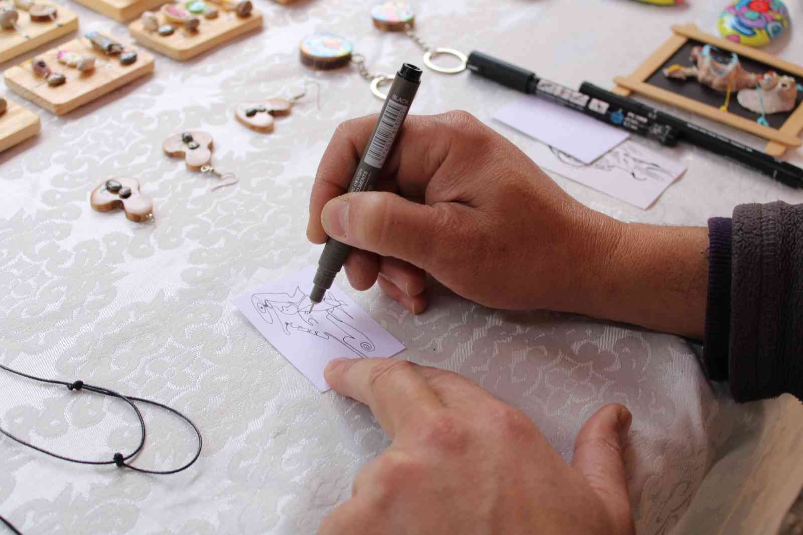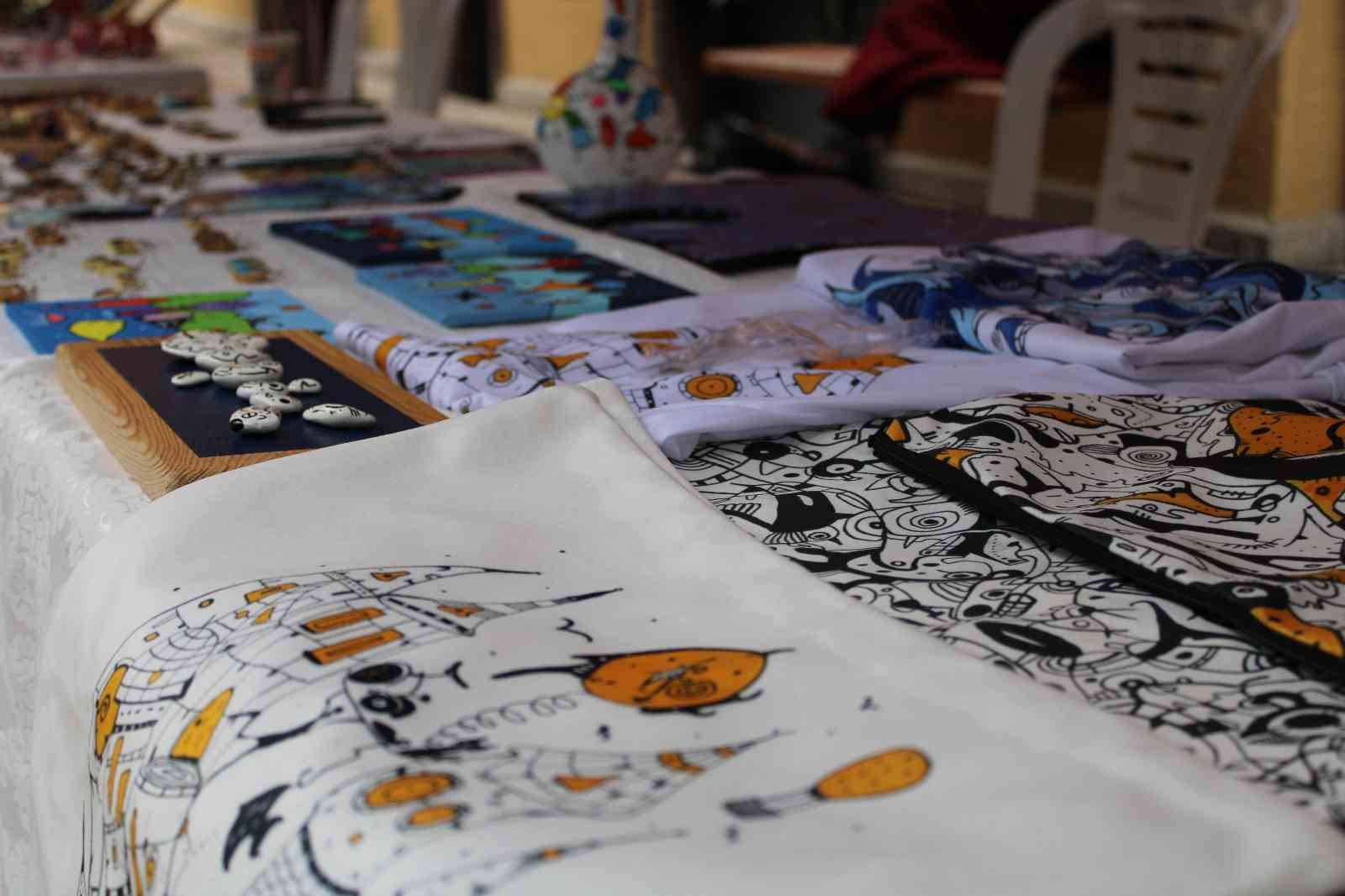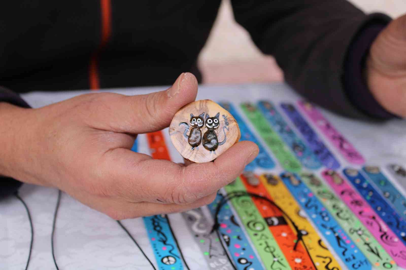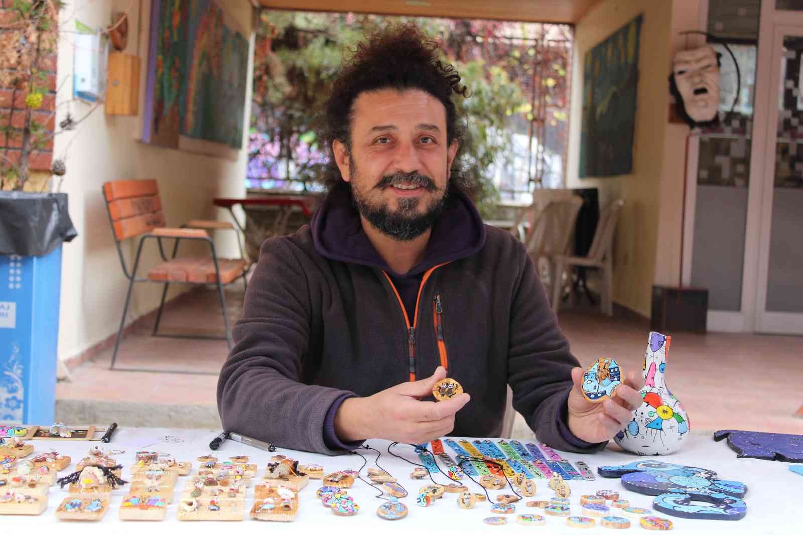 Eskişehir’e yaklaşık 2 yıl önce taşındığını anlatan 45 yaşındaki ressam Aytaç Merkez ise, “Resim yapmakla meşgulüm fakat bunun haricinde sanatımı daha farklı objelerle uyarlamayı başardım. Genellikle zeytin ağacının üzerine minik soyut resimler yapıp takı haline dönüştürüyorum. Deniz kenarından topladığım cam, kabuk ve kuru ahşap parçalarından ürünlerimi geliştiriyorum. Bu sene çizimleri baskılandırma aşamasına geldim ve onları tekstil malzemelerine basmak istiyorum. İlk etapta tişört çanta ve kırlent olarak baskılandırdım” diye ifade etti.