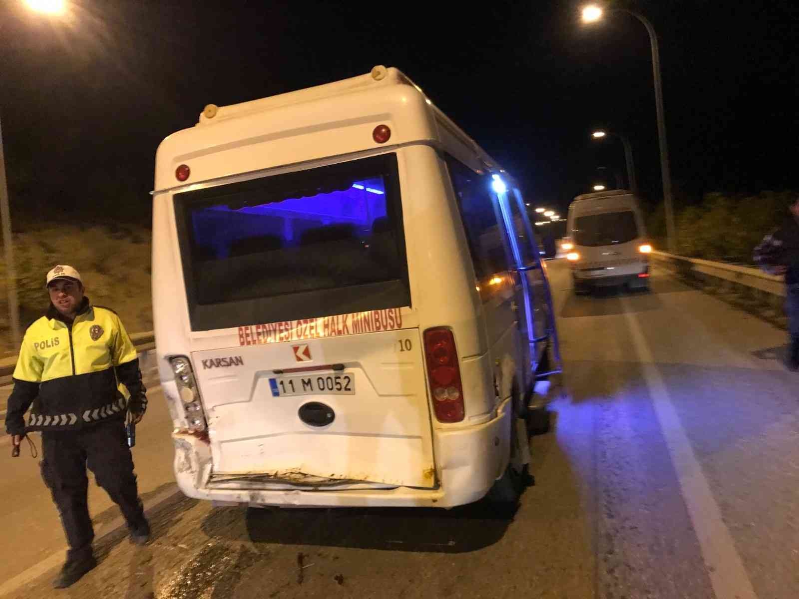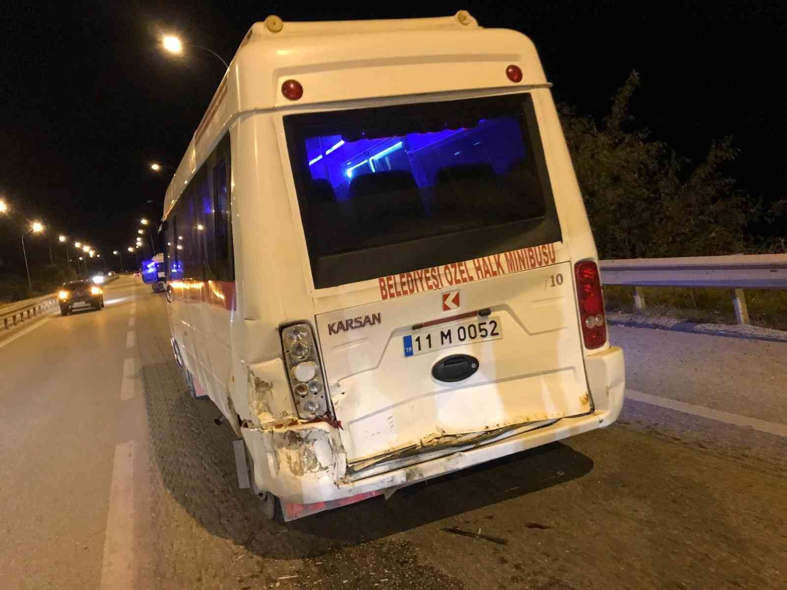 Alınan bilgiye göre, dün gece TOKİ konutları istikametinden Bilecik kent merkezi istikametine seyir halindeki Mesut G. idaresindeki 26 ADD 914 plakalı otomobil ile aynı istikamette ilerleyen Samet Y. yönetimindeki 11 M 0052 plakalı minibüse arkadan çarptı. Meydana gelen trafik kazasında minibüs sürücüsü Samet Y. yaralandı. Yaralı olay yerine gelen 112 Acil Servis ekiplerince yapılan ilk müdahalenin ardından Bilecik Eğitim ve Araştırma Hastanesine kaldırıldı. Yaralının sağlık durumun iyi olduğu öğrenilirken, trafik polisleri kazayla ilgili inceleme başlattı.