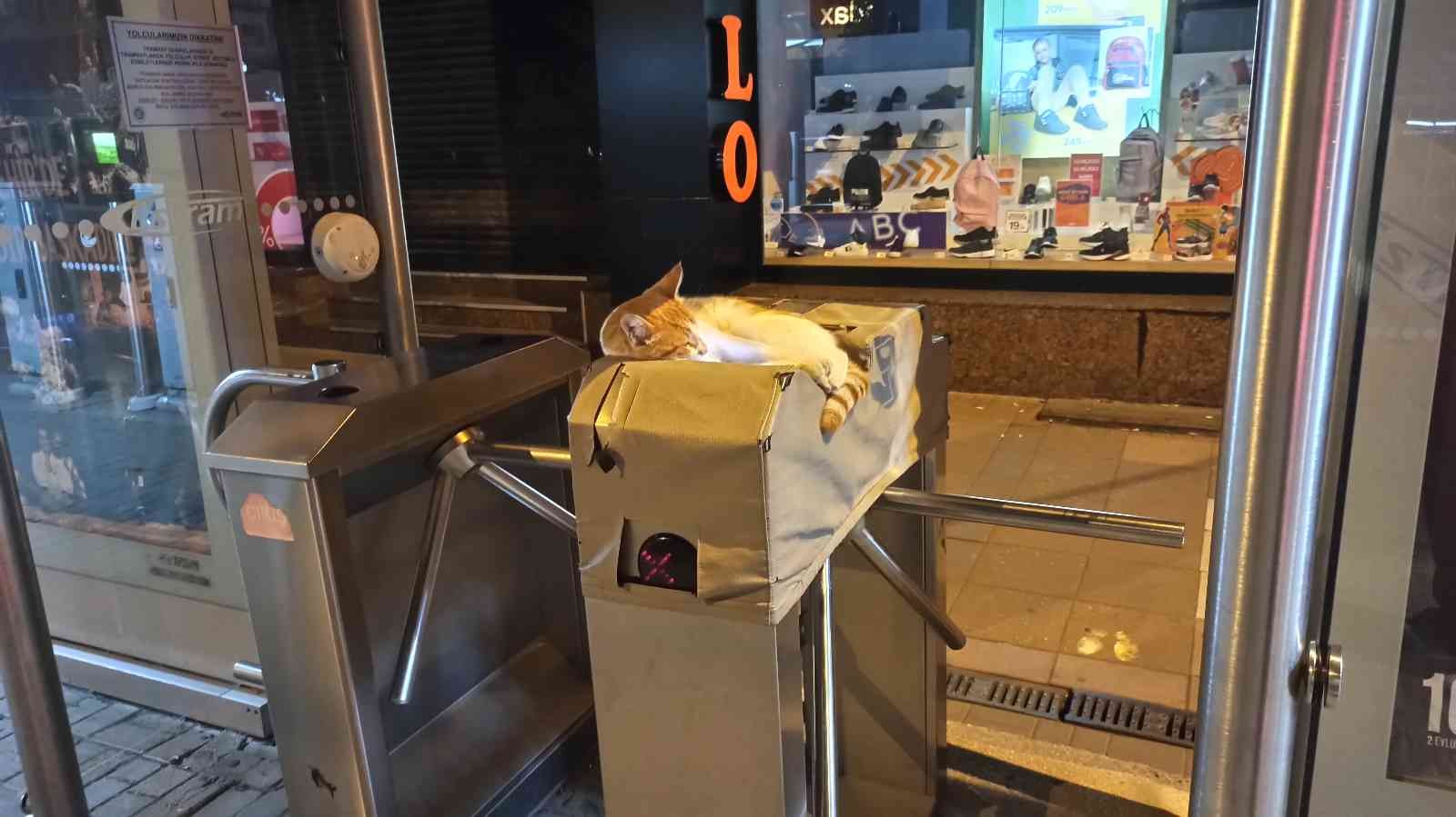 Eskişehir’in kent ulaşımının en yoğun tramvay duraklarından Çarşı durağının bilet okutulduğunda açılan turnikelere uzanan sevimli kedi, insanların ilgisine neden oldu. Tam bilet okutulan noktaya yatan kedi, onlarca yolcu geçişine rağmen rahatından ödün vermedi. Turnikeden geçen vatandaşların sevmeden geçmediği kedinin halini birçok kişi cep telefonları ile fotoğrafını çekti.