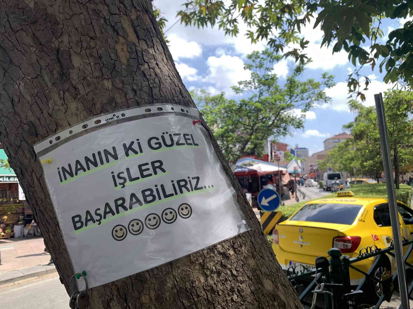 KİM TARAFINDAN YAZILIP AĞAÇLARA ASILDIĞI BİLİNMEYEN NOTLARDA, “AKIL VE FAALİYET İLE BAŞARILAMAYAN İŞ YOKTUR.” VE “İNAN Kİ GÜZEL İŞLER BAŞARABİLİRİZ” BENZERİ SÖZLER YAZILDI.