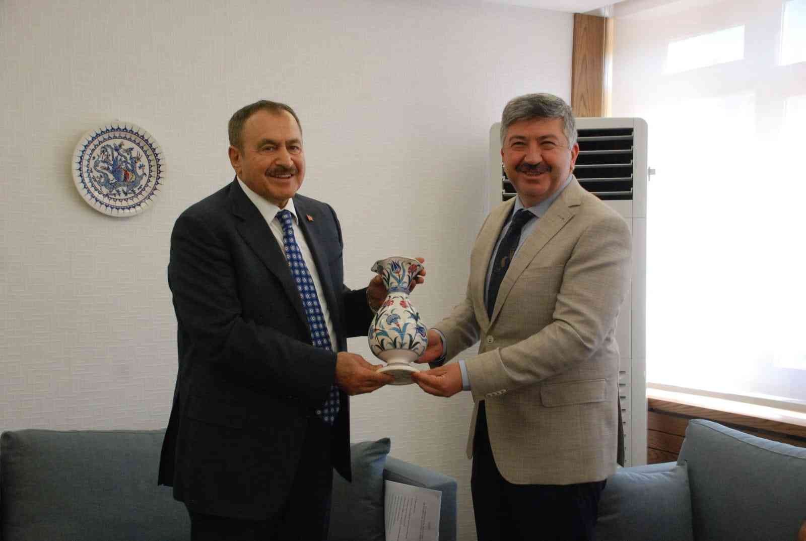 Ziyaretten duyduğu memnuniyeti dile getiren Başkan Akçadurak, nazik ziyaretlerinden dolayı Sayın Prof. Dr. Veysel Eroğlu’na teşekkür ederek çini vazo hediye etti.