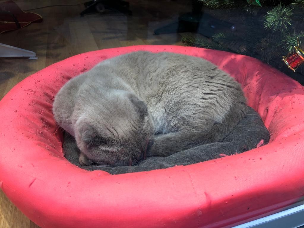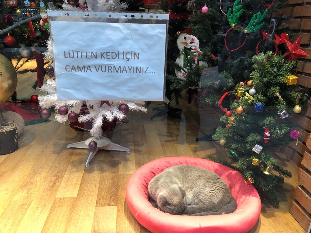 Cengiz Topel Caddesi’nde bir mağazanın vitrininde kimseye aldırış etmeden uyuyan kedi, yoldan geçenlerin ilgi odağı haline geldi. Bazı vatandaşların kedinin ilgisini çekmek için cama vurması üzerine mağaza sahibi çözümü “Lütfen kedi için cama vurmayınız” yazan kağıdı cama asmakta buldu. Yürüyüş esnasında vitrindeki kediye bakmadan geçemeyen vatandaşlar, “Yattığı yer ona çok rahat geliyor olmalı ki sürekli orada yatıyor. Her seferinde burada onu görmek çok hoşumuza gidiyor. Sanki bir vitrin mankeni gibi duruyor orada” dediler.