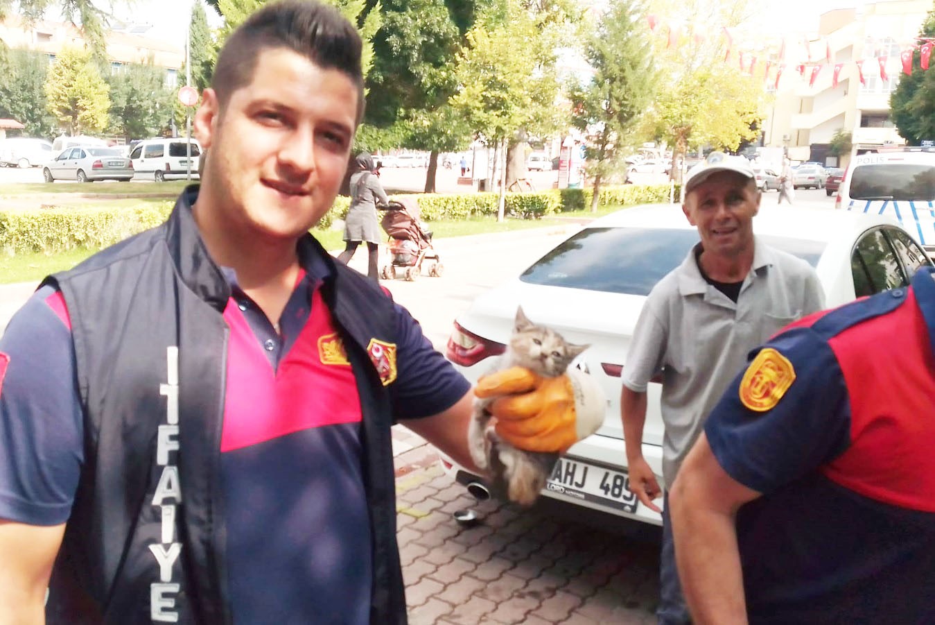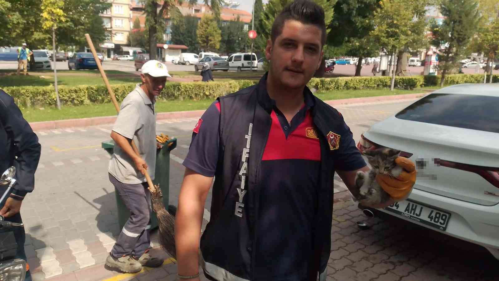 Kütahya’nın Tavşanlı ilçesinde park halindeki otomobilin motor kısmına giren yavru kediyi itfaiye ekibi ve çevre temizlik işçisi ortak çalışması ile kurtarıldı.
