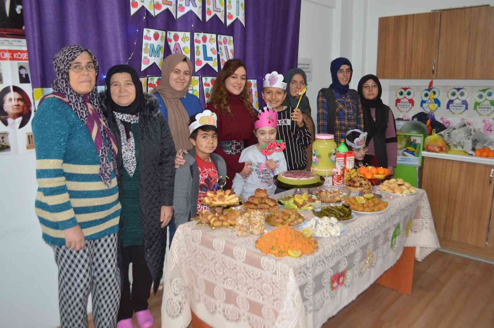 Müzik eşliğinde şarkılar söyleyen çocuklar, aileleri ile birlikte, ülkemizde yetişen sebze – meyveleri, kuruyemişleri, özenle hazırladıkları pasta ve börekleri konuklara ikram ettiler.